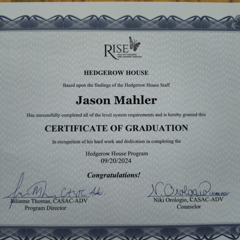 I spent six months in the Hedgerow House program. That was where the real work on my recovery happened. I’d been through five different rehabs before, but it wasn’t until Hedgerow House that I truly began to work on myself and my recovery. Today, I am maintaining my sobriety, working for RISE Above, and enjoying my relationship with my daughters because of my time at Hedgerow. I truly believe I was afforded the opportunity to get this job with RISE Above because of the recovery program I worked while there—the way I carried myself daily and the way I interacted with the staff.