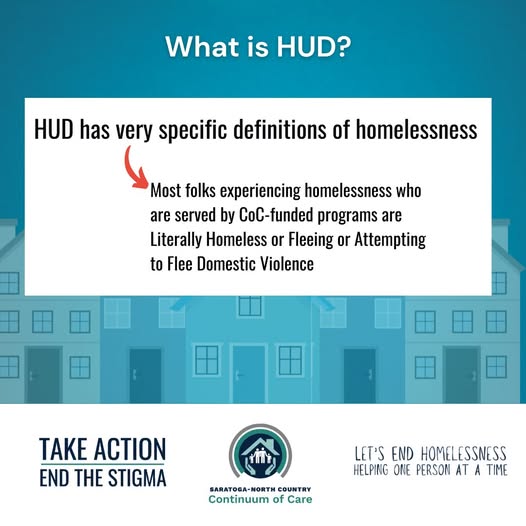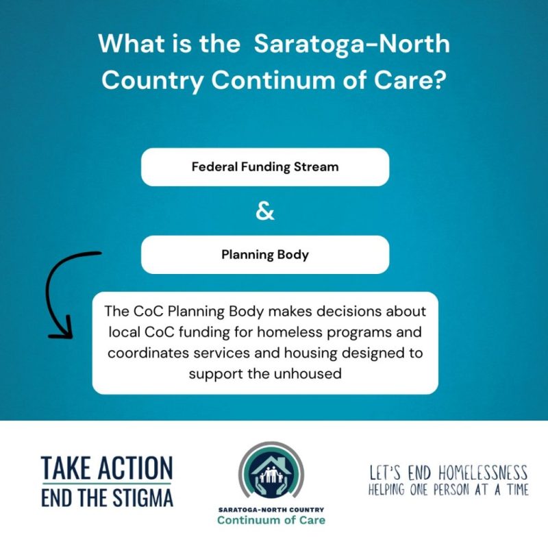 The Saratoga North-Country Continuum of Care is led by a Board of Directors and made up of local organizations and community members working together to address homelessness in Saratoga, Warren, Washington, and Hamilton Counties. It provides a space for partners to share ideas, identify needs, and find solutions to better support people facing housing challenges. Each year, the CoC also applies for federal funding through HUD to help bring resources and services to the region.