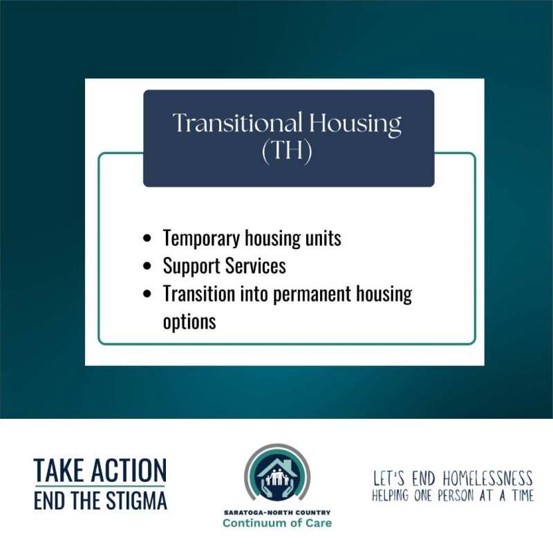 - Transitional Housing: Temporary housing that provides a safe place to stay while people work toward stable, permanent housing.