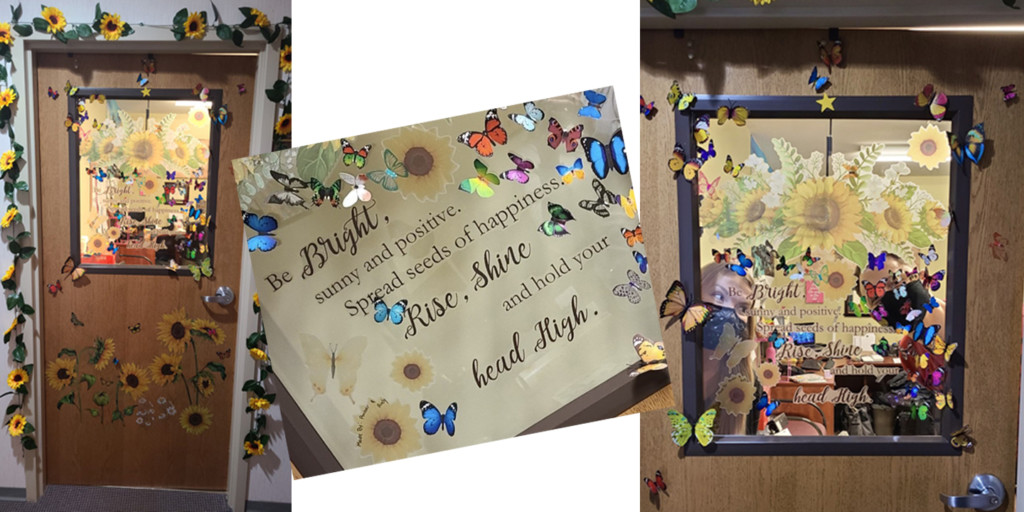 Amber and Andy peeing out the window of Amber's Sunflowers and Butterflies Door amber_door_2 Sizes: 150 × 150 / 500 × 250 / 630 × 315 / 630 × 315 / 1,024 × 512